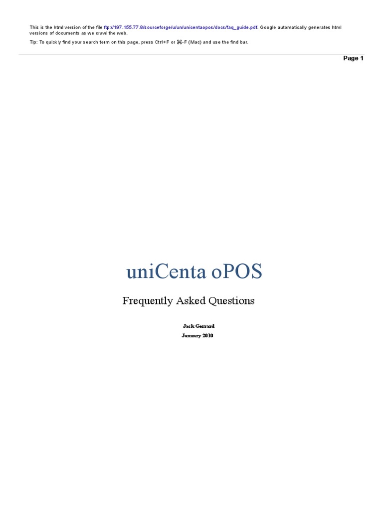 This is the html version of the file ftp://197.155.77.8/sourceforge/u/un/unicentaopos/docs/faq_guide.pdf.
