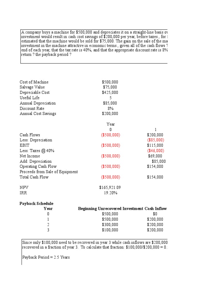 investment would result in cash cost savings of $200,000 per year, before taxes , for five years. At the end of the fiv