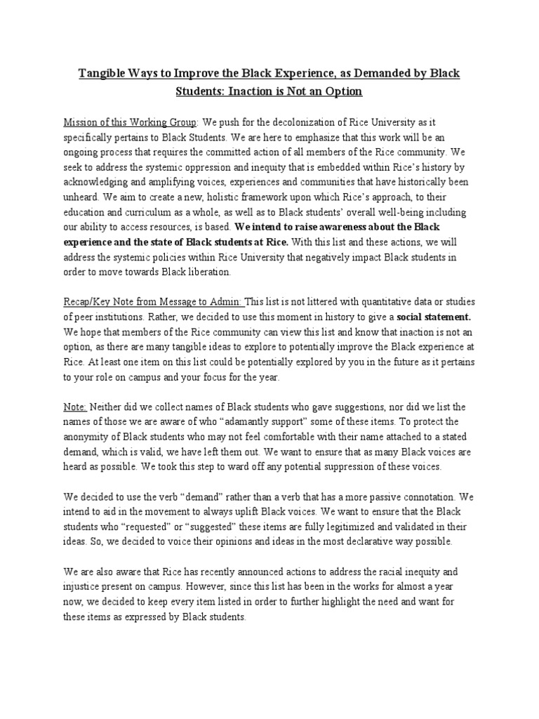 With this list and these actions, we will address the systemic policies within Rice University that negatively impact Black students in order to move towards Black liberation. Recap/Key Note from Message to Admin: This list is not littered with quantitative data or studies of peer institutions. Rather, we decided to use this moment in history to give a