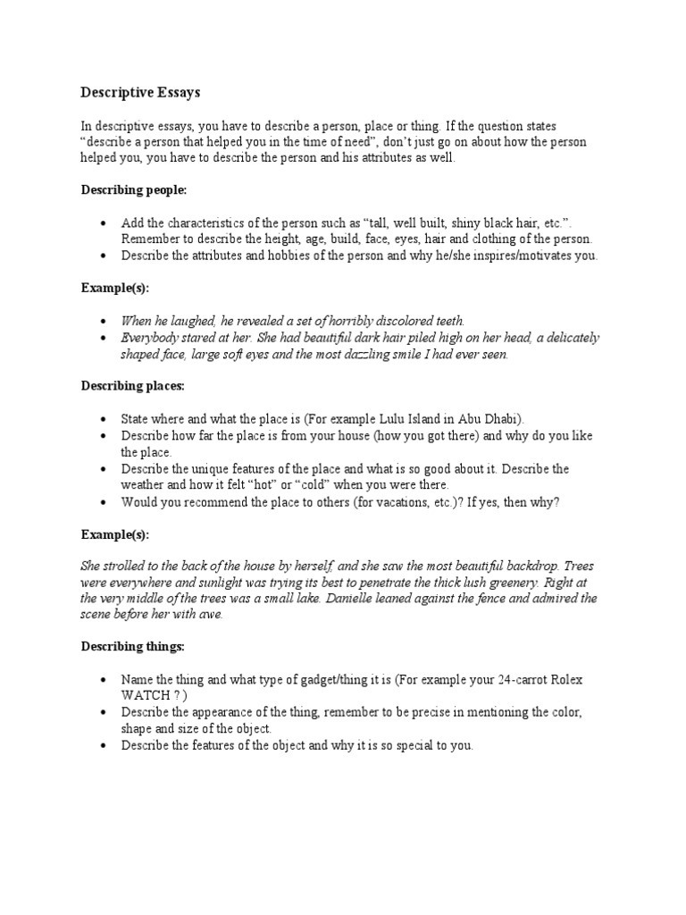 In descriptive essays, you have to describe a person, place or thing. If the question states