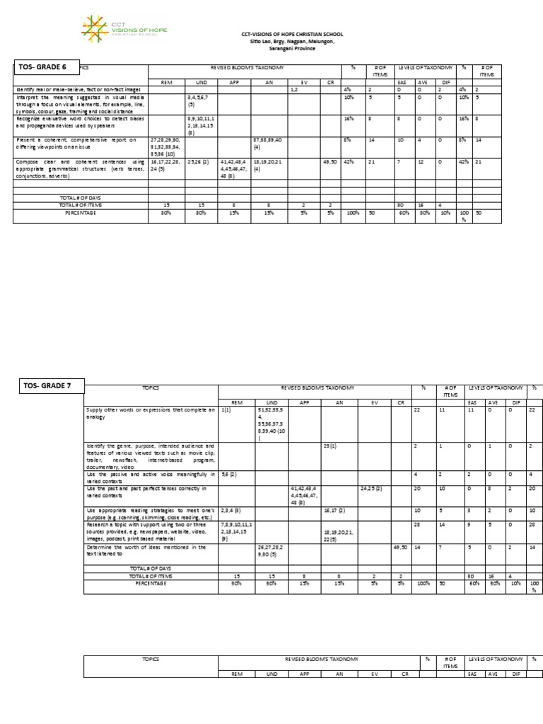 TOS- GRADE 7 TOPICS REVISED BLOOM’S TAXONOMY % # OF LEVELS OF TAXONOMY %