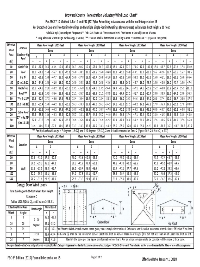 Design is based on the 3-second gust (wind velocity) for Risk Category II (general residential & commercial construction) per FBC 1620.2 Broward. These tables not for use with essential facilities or assembly occupancies.