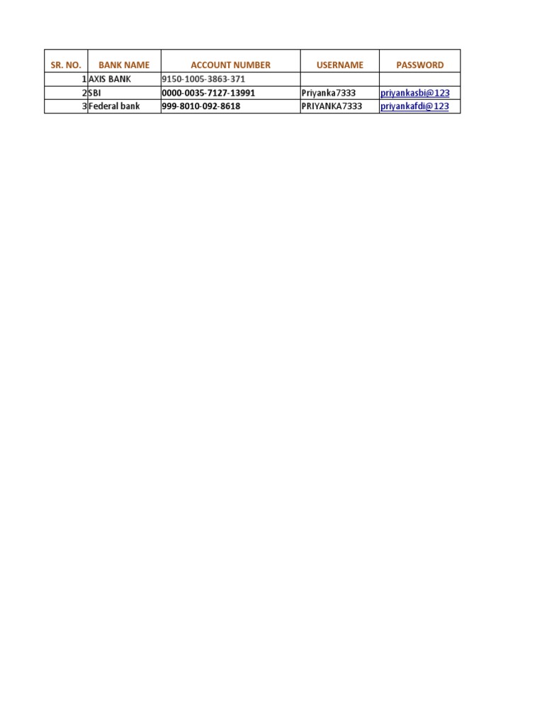 1 Axis Bank 2 Sbi Priyanka7333 3 Federal Bank PRIYANKA7333: Sr. No. Bank Name Account Number Username Password