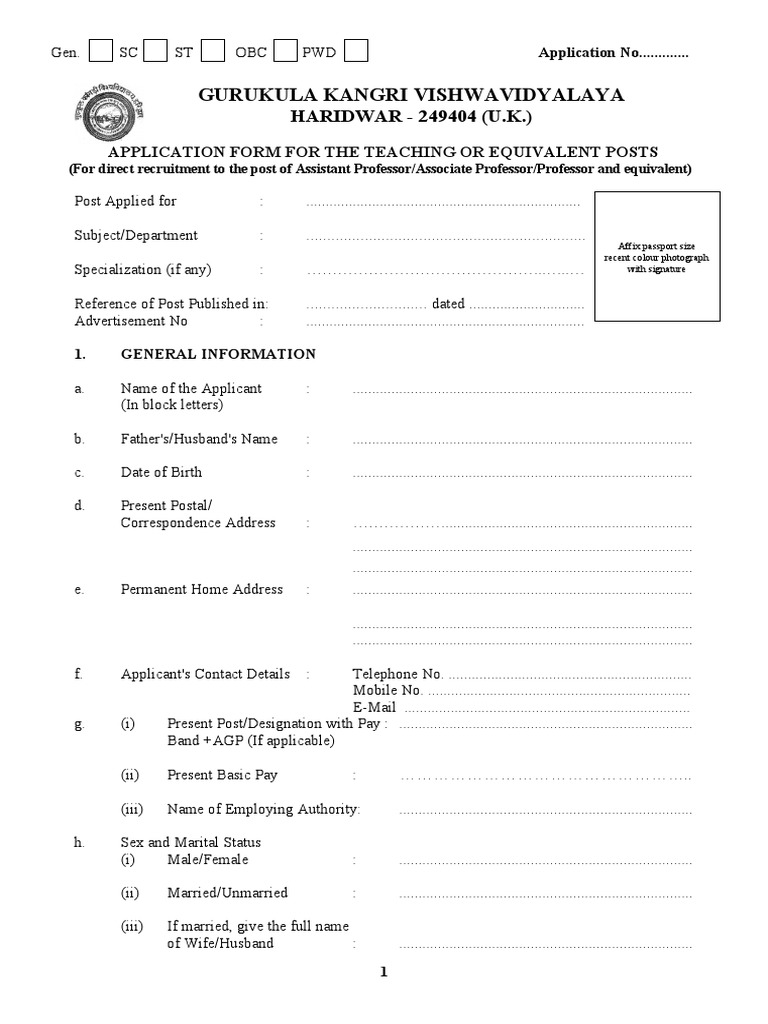 APPLICATION FORM FOR THE TEACHING OR EQUIVALENT POSTS