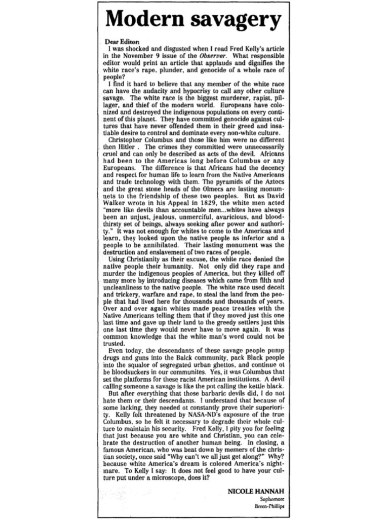 Nicole Hannah-Jones, an investigative reporter and founder of the 1619 Project, wrote a response article to Notre Dame’s The Observer stating that “the white race is the biggest murderer, ra…