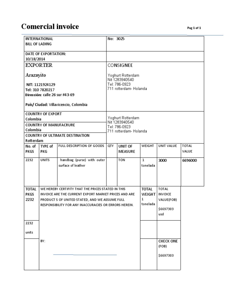 País/ Ciudad: Villavicencio, Colombia goods specified below, the weight and volume