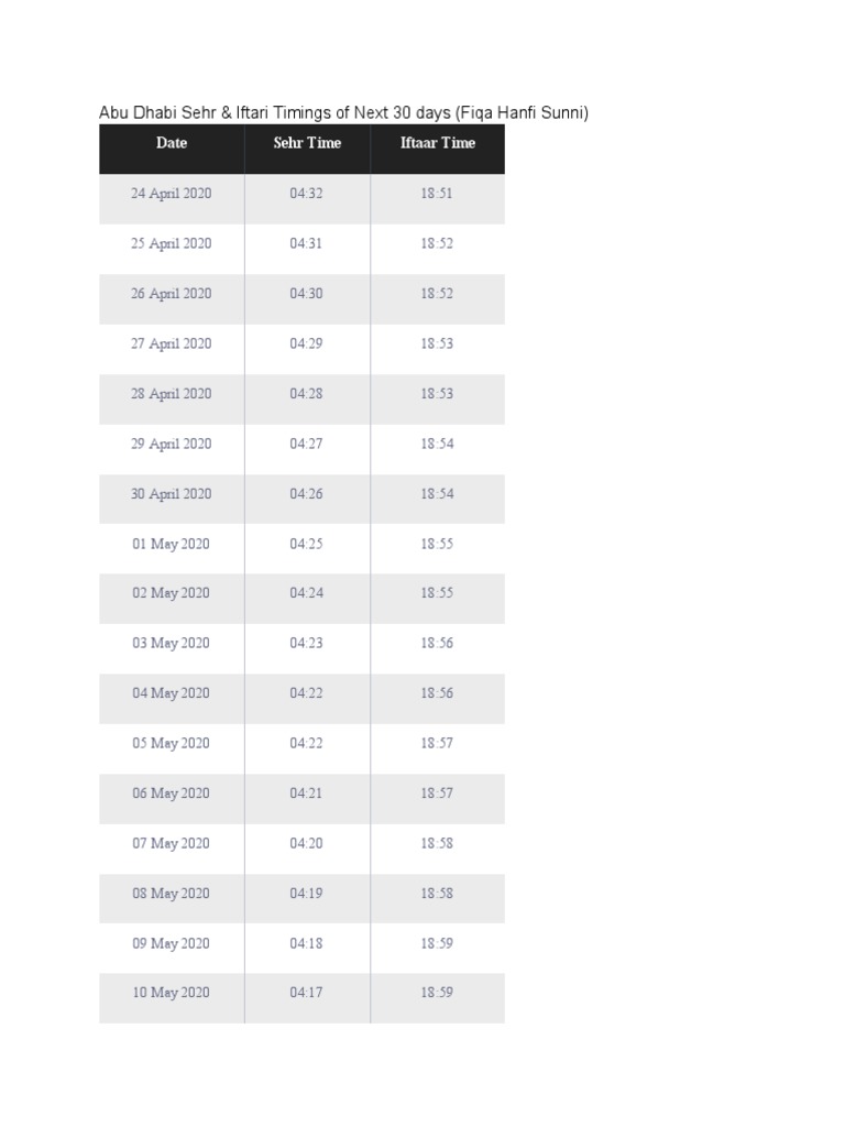 Abu Dhabi Sehr & Iftari Timings of Next 30 days (Fiqa Hanfi Sunni)