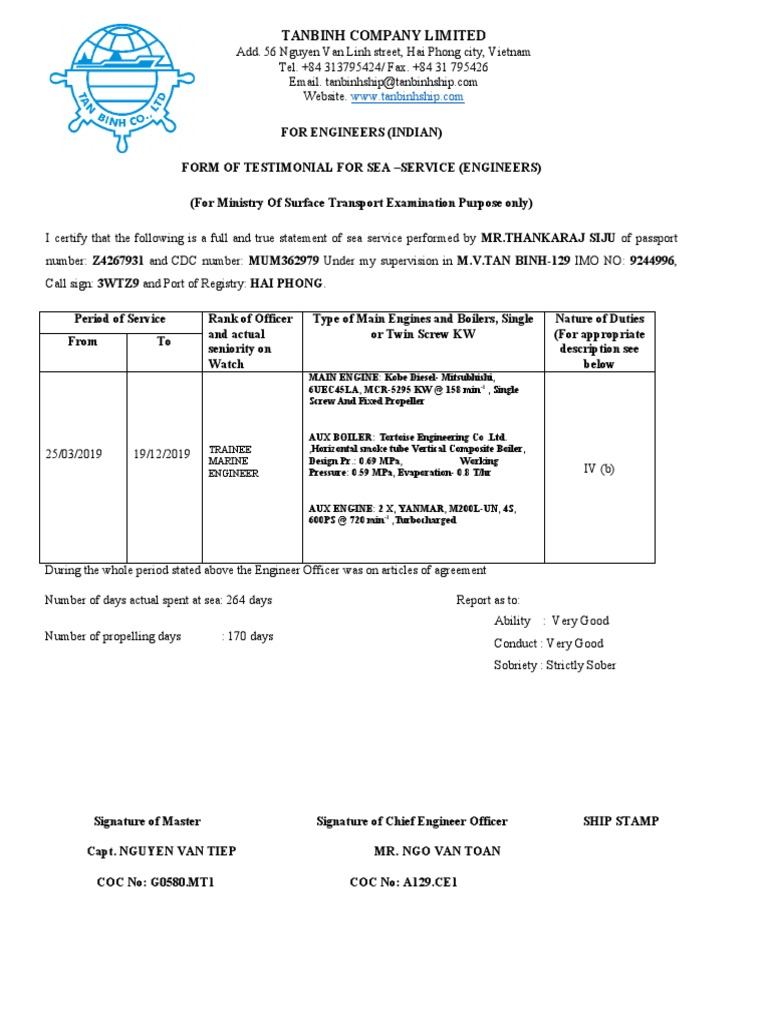 number: Z4267931 and CDC number: MUM362979 Under my supervision in M.V.TAN BINH-129 IMO NO: 9244996,