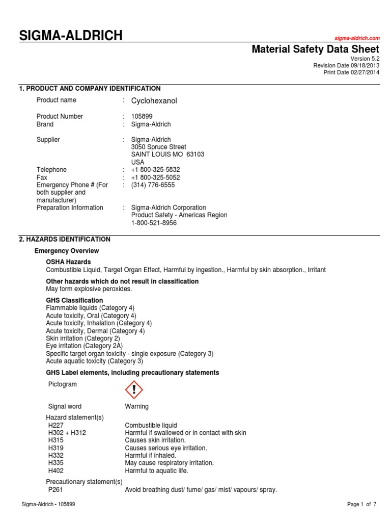 Proper shipping name: Combustible liquid, n.o.s. (Cyclohexanol)