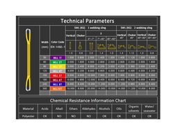 Technical Parameters: Provides detailed technical parameters for different widths and color codes of slings, including load capacities and chemical resistance.