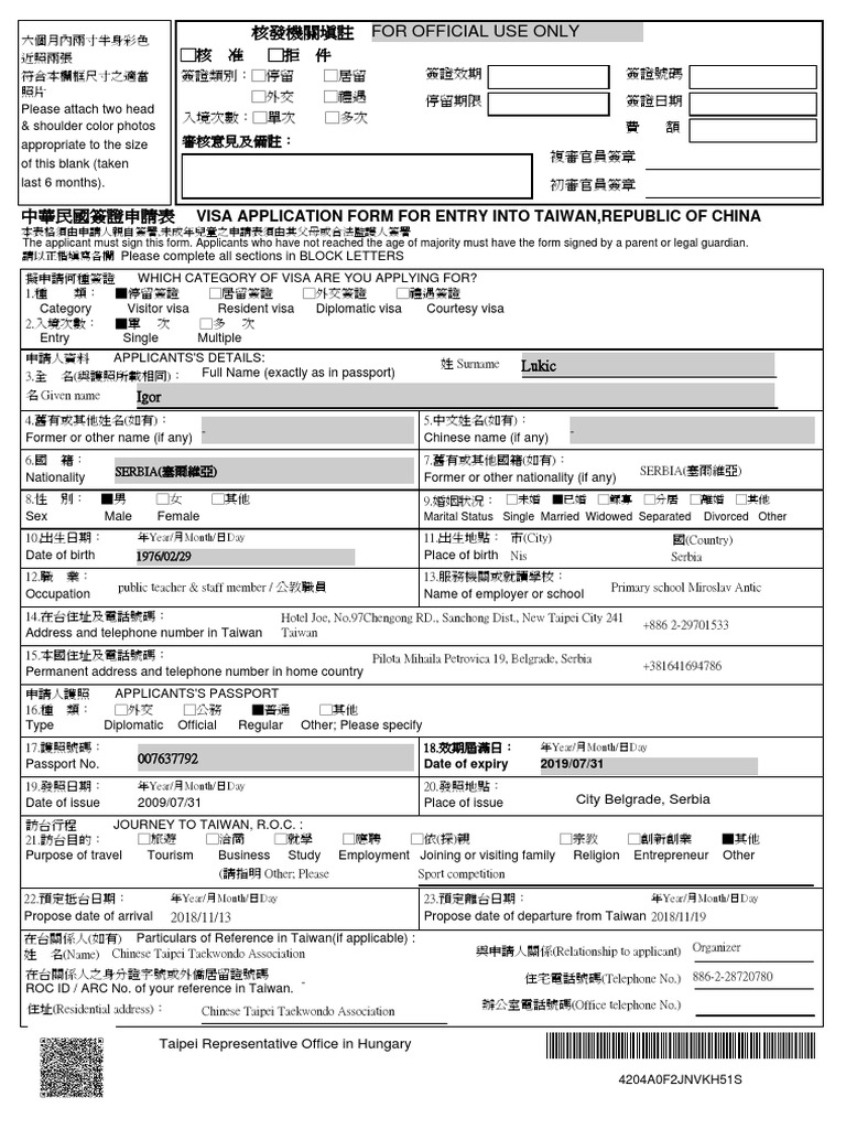 中華民國簽證申請表 VISA APPLICATION FORM FOR ENTRY INTO TAIWAN,REPUBLIC OF CHINA