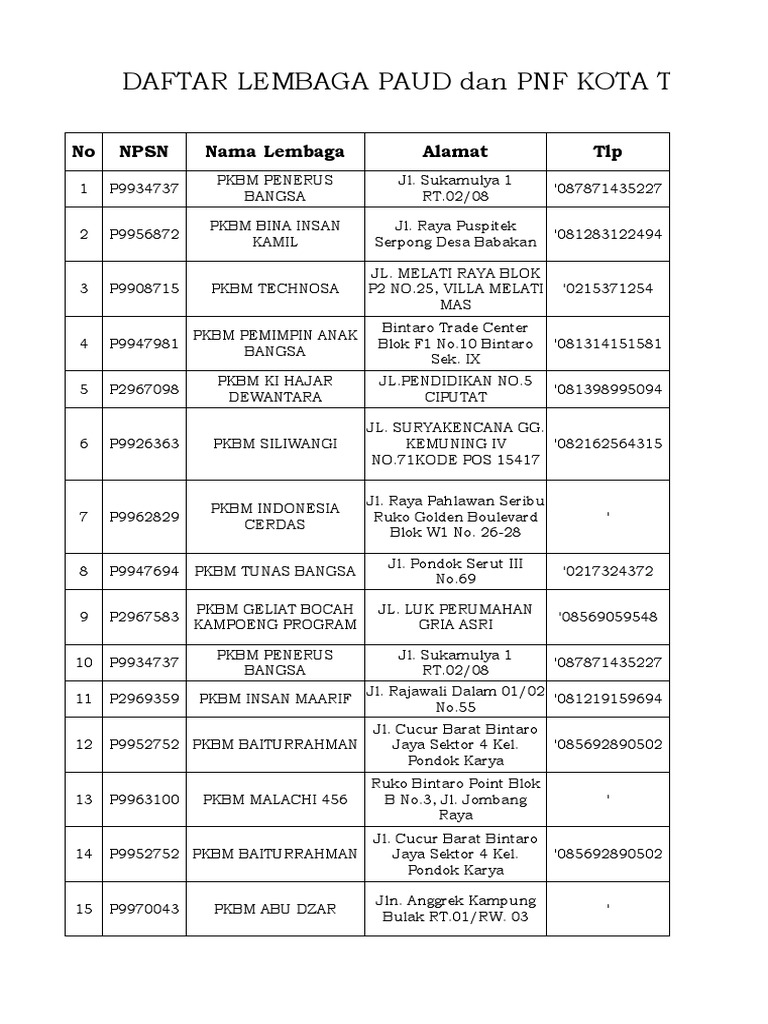 DAFTAR LEMBAGA PAUD dan PNF KOTA TANGSEL