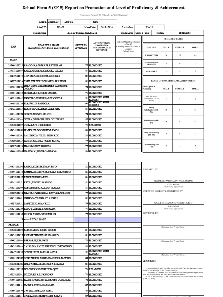 School Form 5 (SF 5) Report on Promotion and Level of Proficiency & Achievement