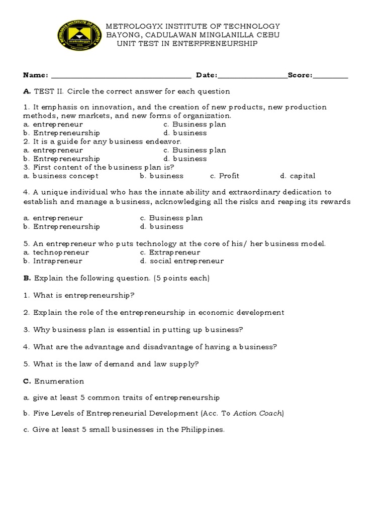 UNIT TEST IN ENTERPRENEURSHIP