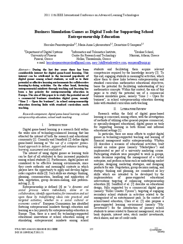 digital games among school students, as well as to their allow them to draw links between entrepreneurship and