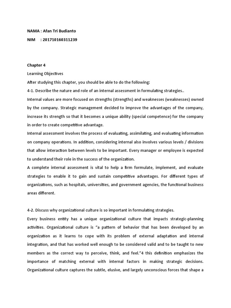 4-1. Describe the nature and role of an internal assessment in formulating strategies..