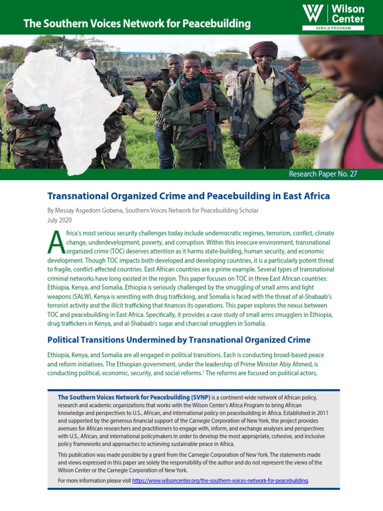 frica’s most serious security challenges today include undemocratic regimes, terrorism, conflict, climate change, underdevelopment, poverty, and corruption. Within this insecure environment, transnational organized crime (TOC) deserves attention as it harms state-building, human security, and economic development. Though TOC impacts both developed and developing countries, it is a particularly potent threat to fragile, conflict-affected countries. East African countries are a prime example. Several types of transnational criminal networks have long existed in the region. This paper focuses on TOC in three East African countries: Ethiopia, Kenya, and Somalia. Ethiopia is seriously challenged by the smuggling of small arms and light weapons (SALW), Kenya is wrestling with drug trafficking, and Somalia is faced with the threat of al-Shabaab’s terrorist activity and the illicit trafficking that finances its operations. This paper explores the nexus between TOC and peacebuilding in East Africa. Specifically, it provides a case study of small arms smugglers in Ethiopia, drug traffickers in Kenya, and al-Shabaab’s sugar and charcoal smugglers in Somalia.