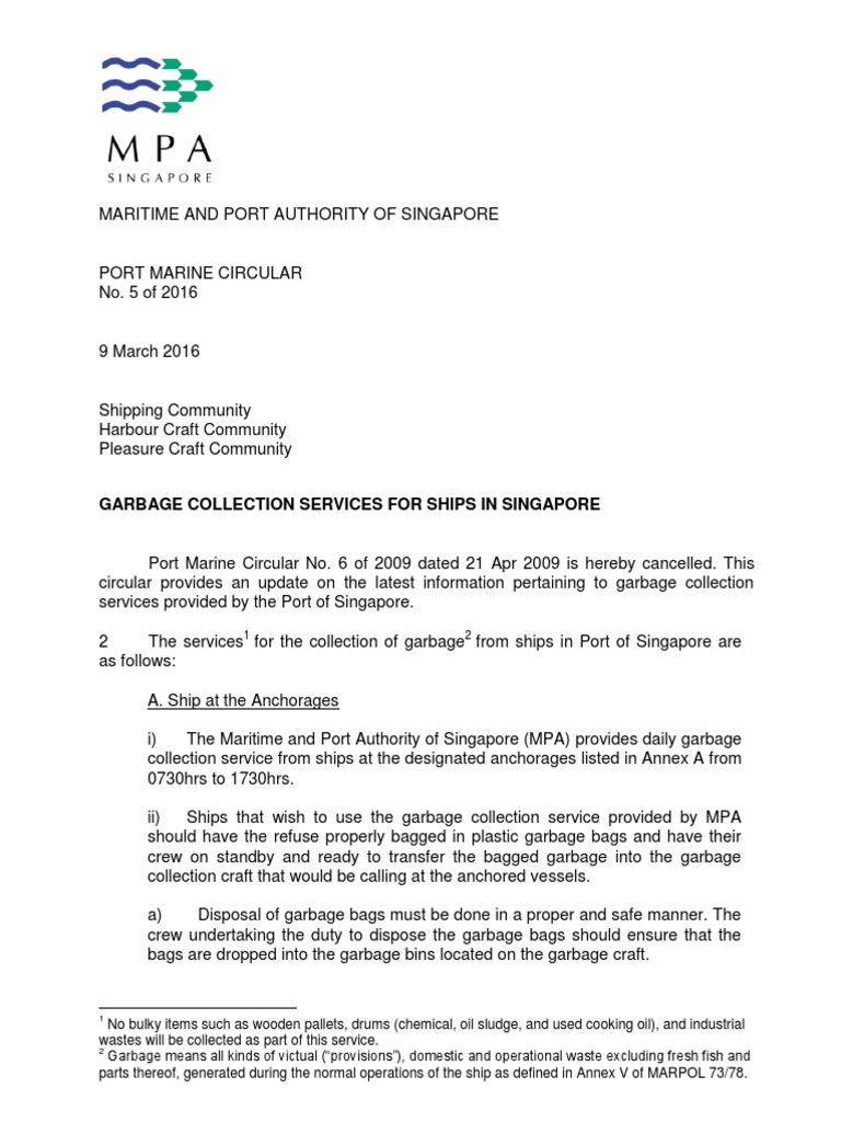 i) The Maritime and Port Authority of Singapore (MPA) provides daily garbage