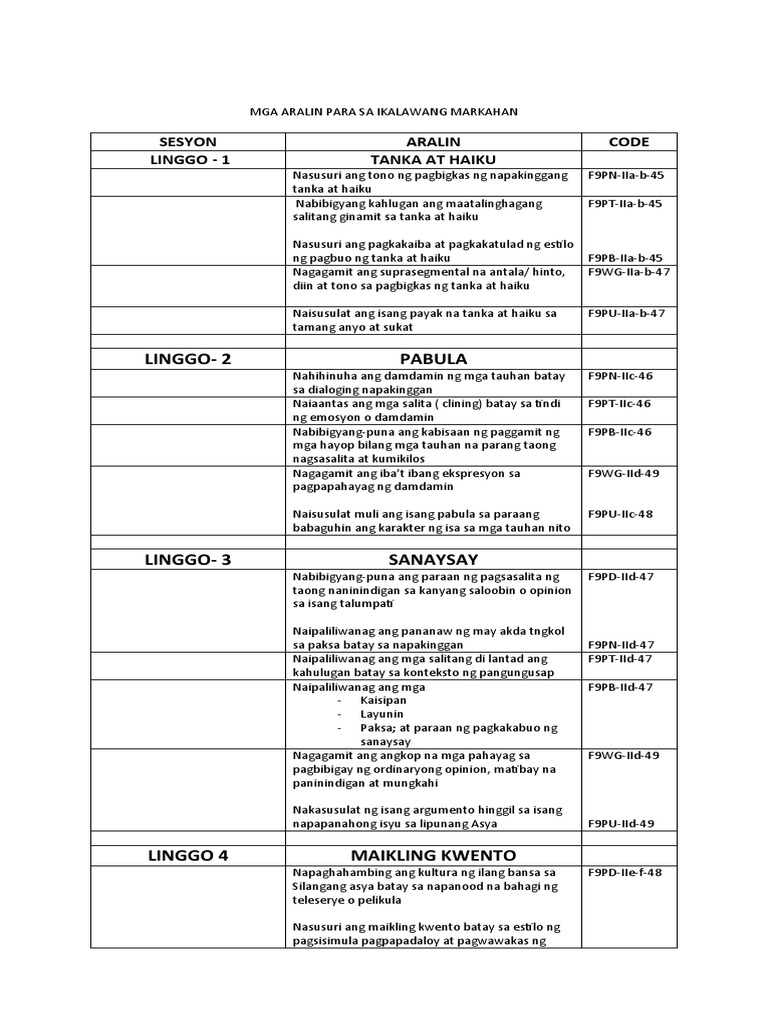 MGA ARALIN PARA SA IKALAWANG MARKAHAN