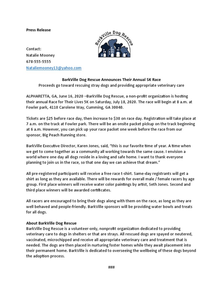 ALPHARETTA, GA, June 16, 2020 –BarkVille Dog Rescue, a non-profit organization is hosting