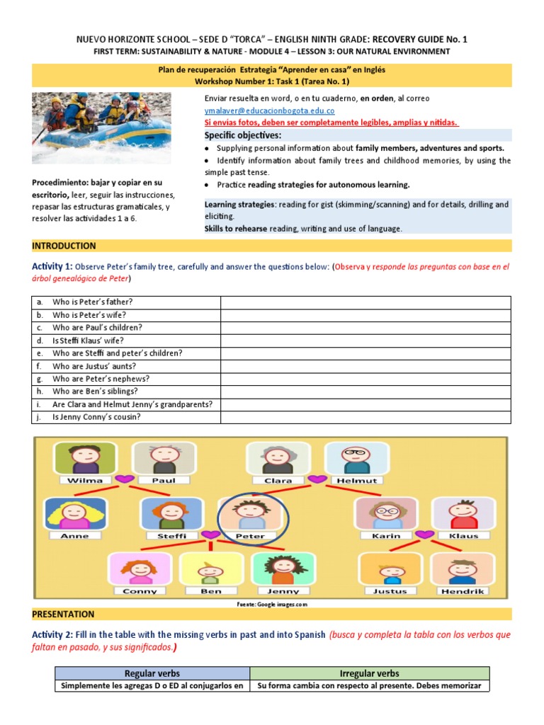 Activity 1: Observe Peter’s family tree, carefully and answer the questions below: (Observa y responde las preguntas con base en el