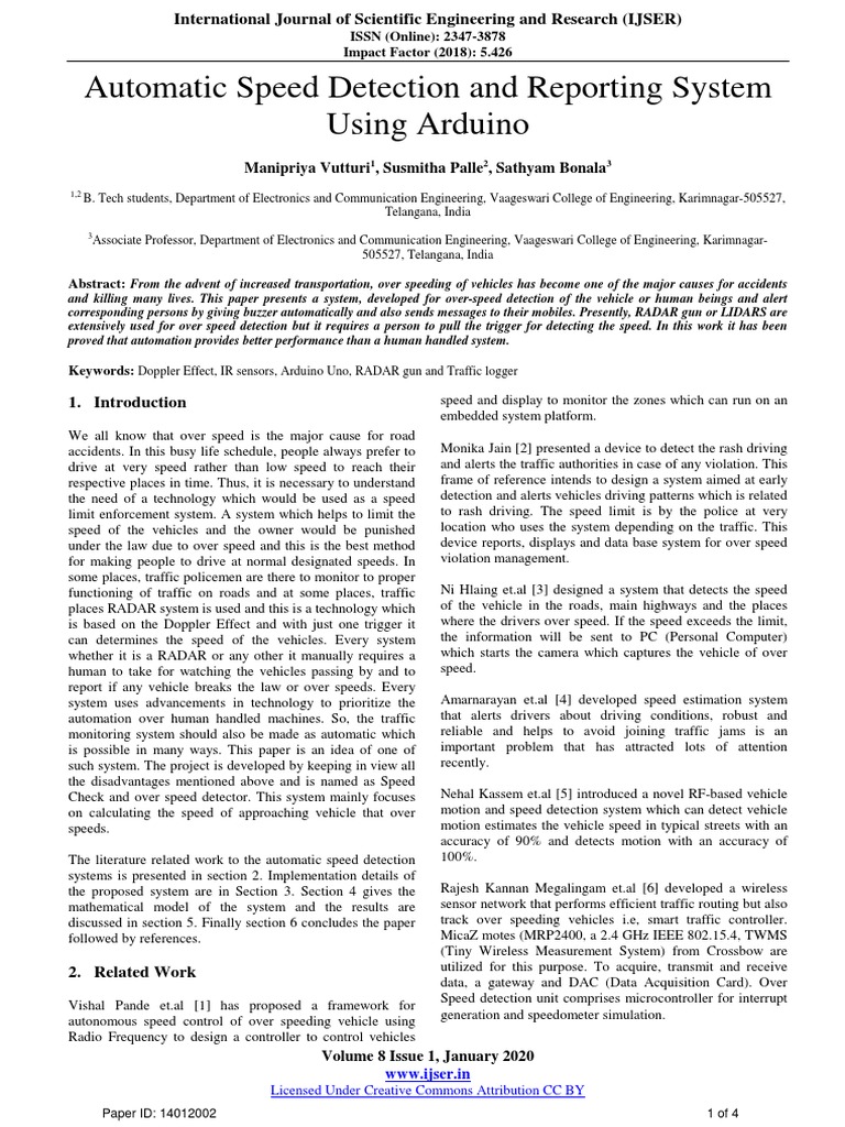 Keywords: Doppler Effect, IR sensors, Arduino Uno, RADAR gun and Traffic logger