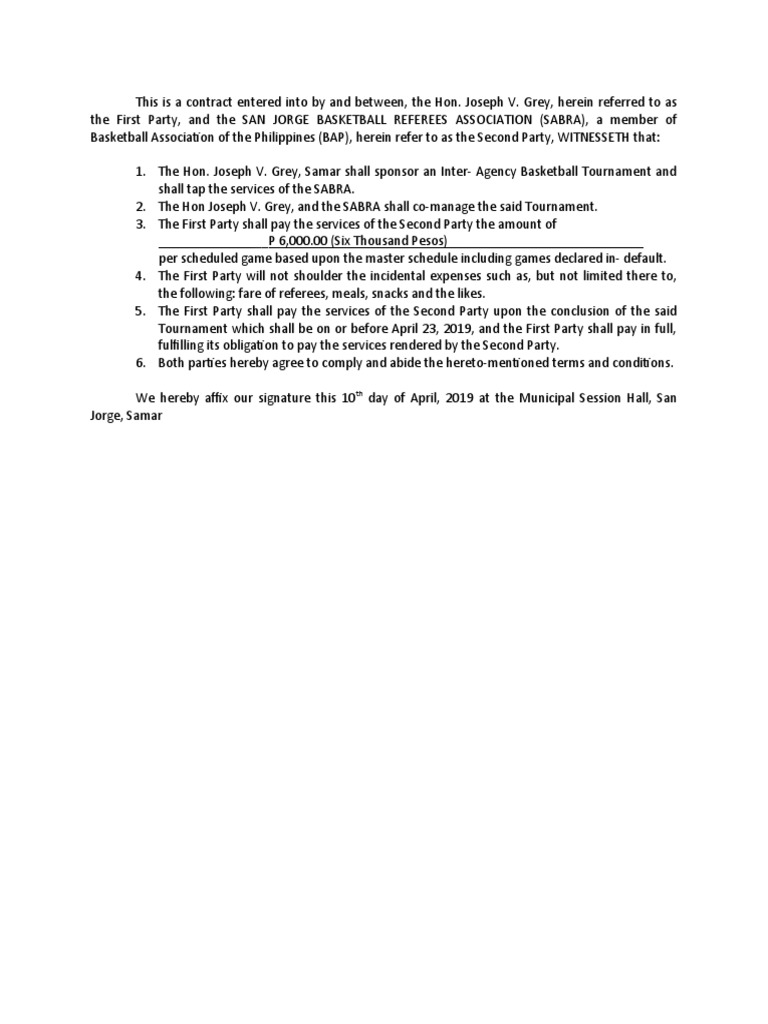 the First Party, and the SAN JORGE BASKETBALL REFEREES ASSOCIATION (SABRA), a member of