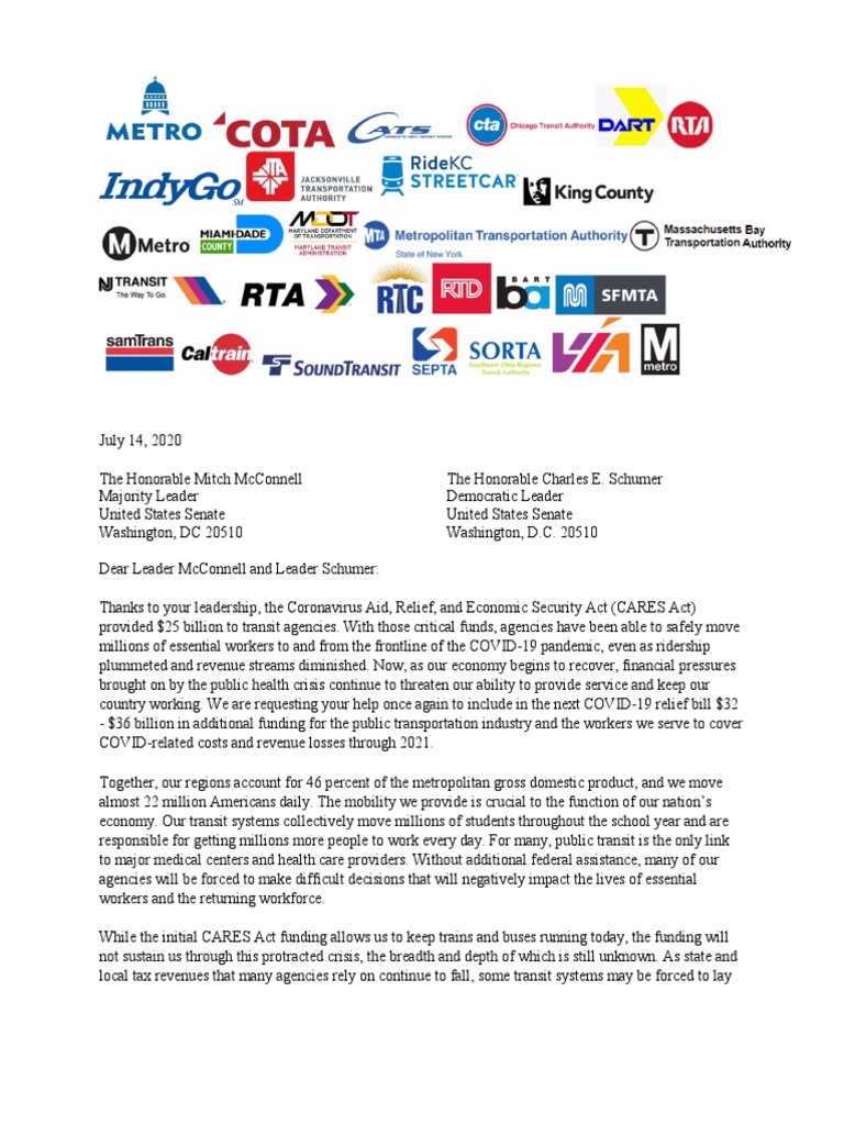 July 14, 2020 The Honorable Mitch McConnell Majority Leader United States Senate Washington, DC 20510 The Honorable Charles E. Schumer Democratic Leader United States Senate Washington, D.C. 20510Dear Leader McConnell and Leader Schumer: Thanks to your leadership, the Coronavirus Aid, Relief, and Economic Security Act (CARES Act) provided $25 billion to transit agencies. With those critical funds, agencies have been able to safely move millions of essential workers to and from the frontline of the COVID-19 pandemic, even as ridership plummeted and revenue streams diminished. Now, as our economy begins to recover, financial pressures brought on by the public health crisis continue to threaten our ability to provide service and keep our country working. We are requesting your help once again to include in the next COVID-19 relief bill $32 - $36 billion in additional funding for the public transportation industry and the workers we serve to cover COVID-related costs and revenue losses through 2021. Together, our regions account for 46 percent of the metropolitan gross domestic product, and we move almost 22 million Americans daily. The mobility we provide is crucial to the function of our nation’s economy. Our transit systems collectively move millions of students throughout the school year and are responsible for getting millions more people to work every day. For many, public transit is the only link to major medical centers and health care providers. Without additional federal assistance, many of our agencies will be forced to make difficult decisions that will negatively impact the lives of essential workers and the returning workforce. While the initial CARES Act funding allows us to keep trains and buses running today, the funding will not sustain us through this protracted crisis, the breadth and depth of which is still unknown. As state and local tax revenues that many agencies rely on continue to fall, some transit systems may be forced to lay