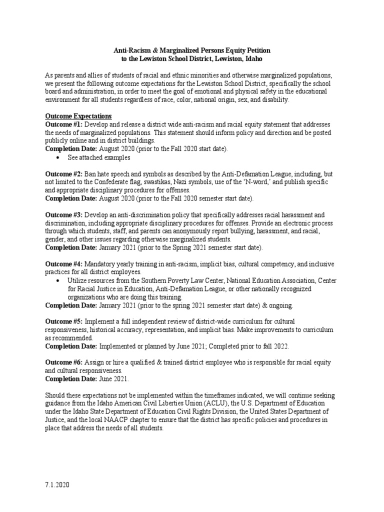 Outcome #1: Develop and release a district wide anti-racism and racial equity statement that addresses
