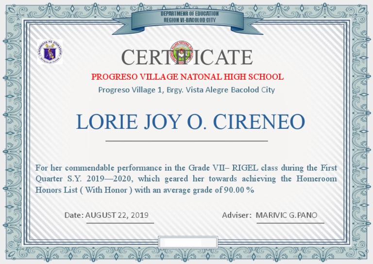 Honors List ( With Honor ) with an average grade of 90.00 %