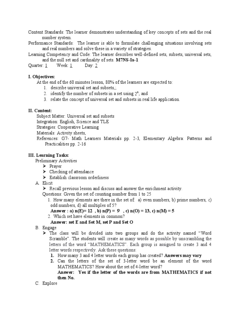 Learning Competency and Code: The learner describes well-defined sets, subsets, universal sets,