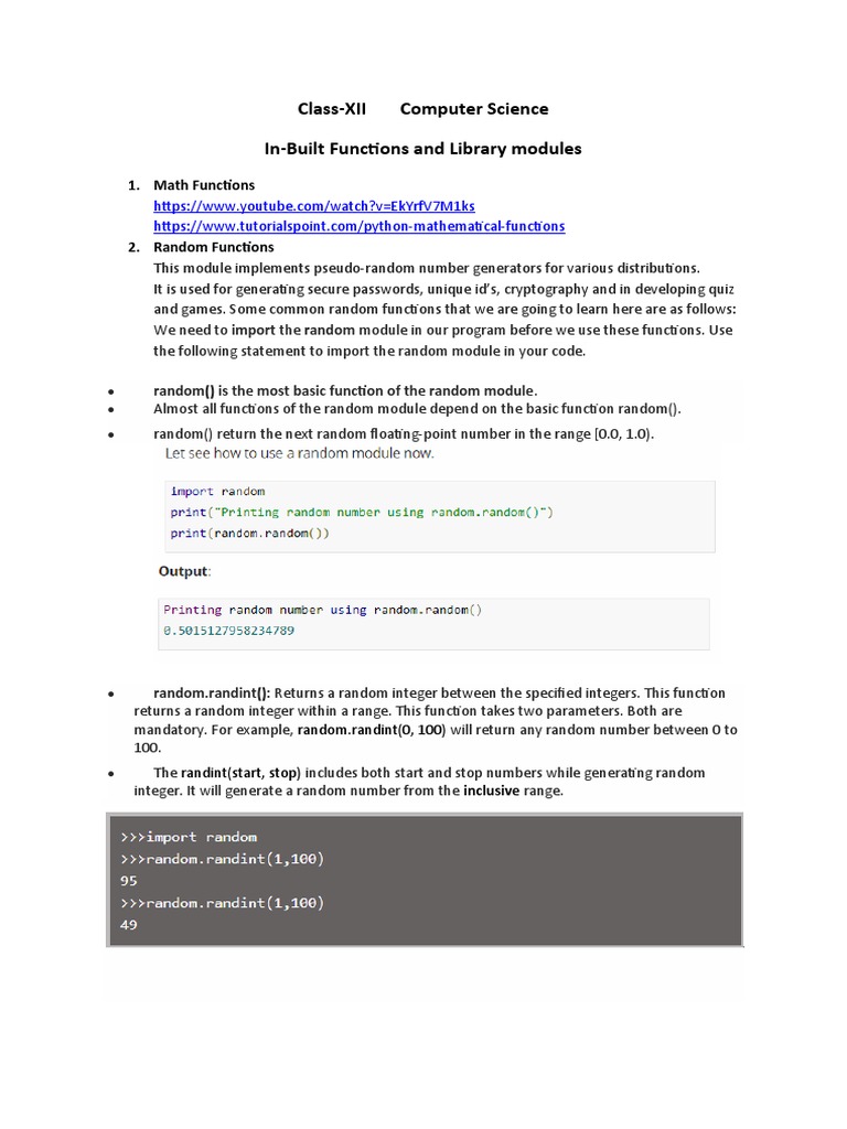 and games. Some common random functions that we are going to learn here are as follows: