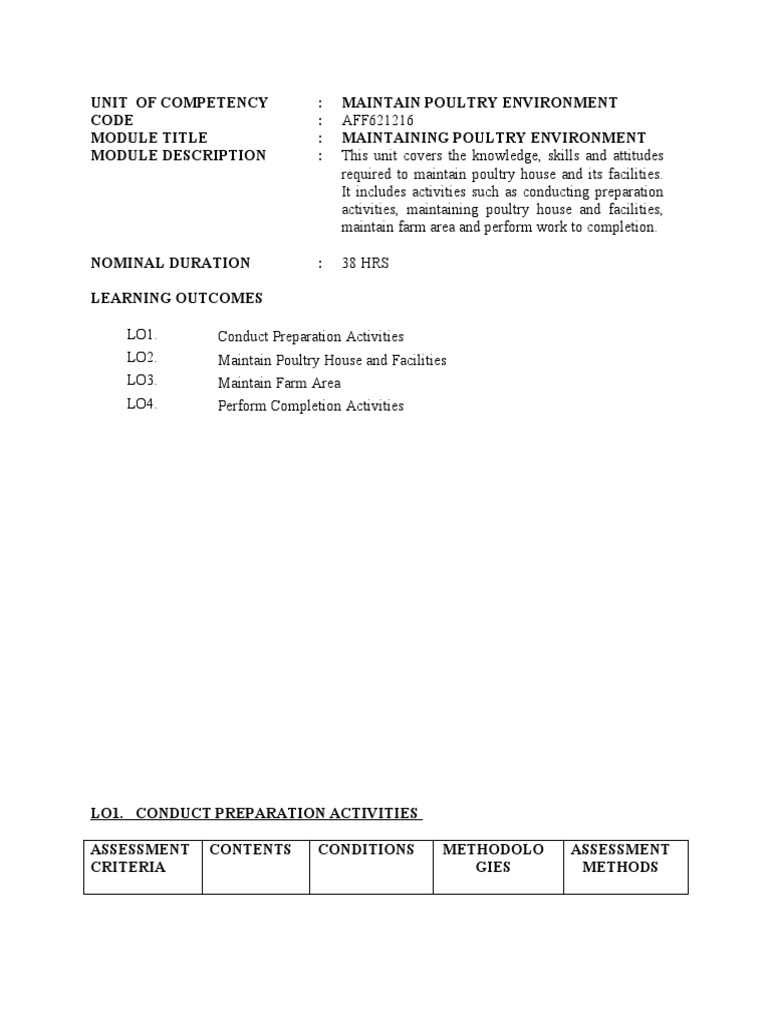 LO2. MAINTAIN POULTRY HOUSE AND FACILITIES