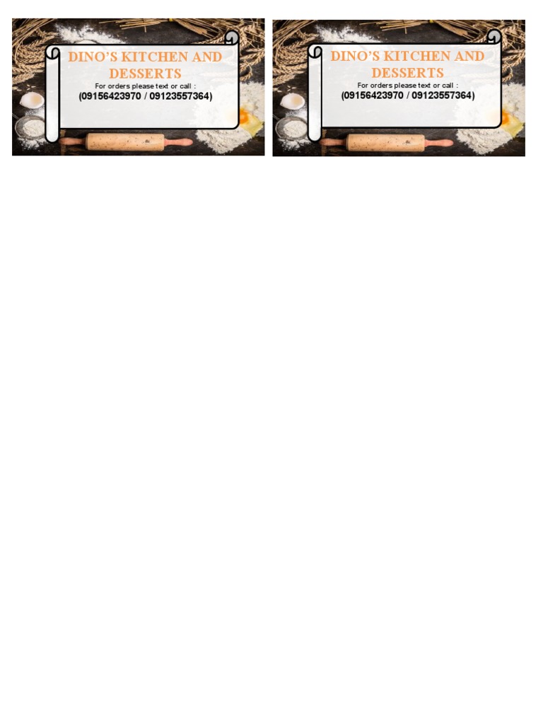 Dino's Kitchen and Desserts is a food business that provides home delivery and takeout. Customers can place orders by texting or calling the two mobile numbers listed. The document shares contact information for ordering from Dino's Kitchen and Desserts.