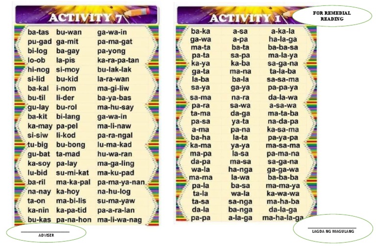 For Remedial Reading: - Adviser - Lagda NG Magulang