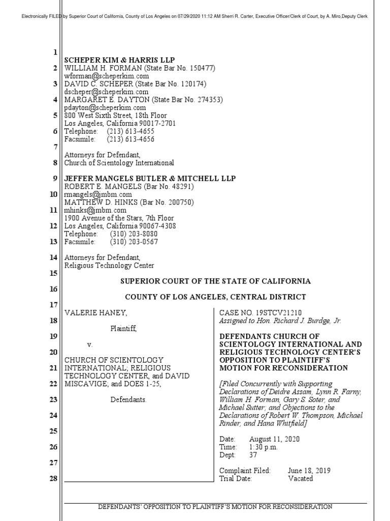 VALERIE HANEY, Plaintiff, v. CHURCH OF SCIENTOLOGY INTERNATIONAL; RELIGIOUS TECHNOLOGY CENTER, and DAVID MISCAVIGE; and DOES 1-25, Defendants. CASE NO. 19STCV21210