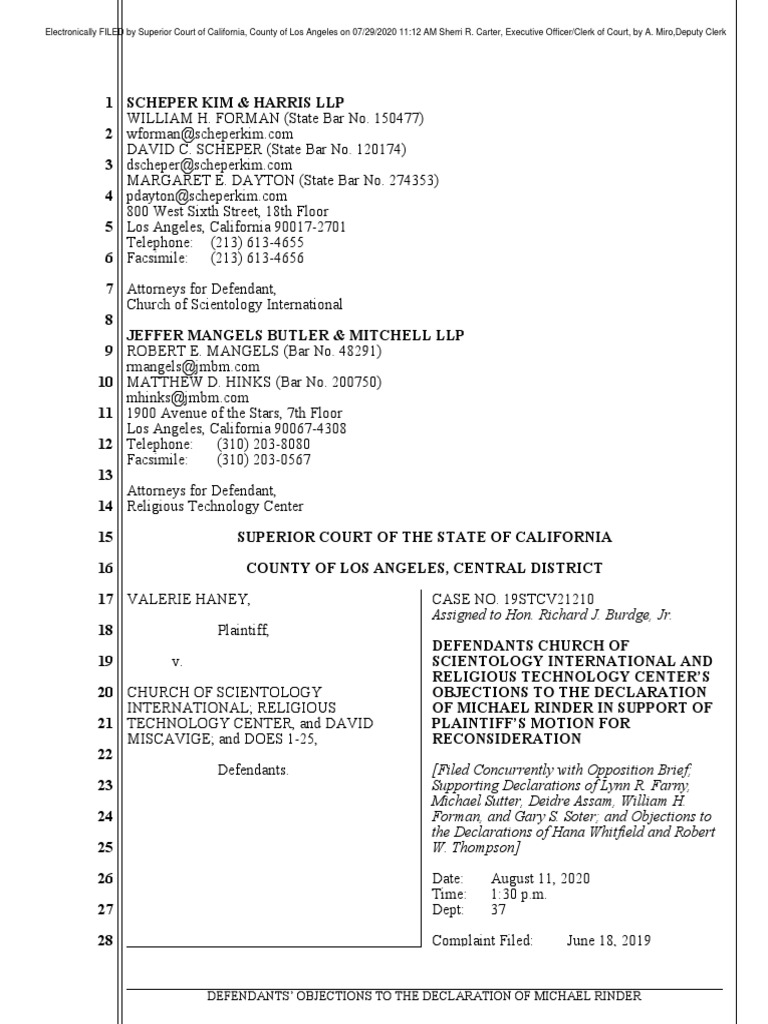 DEFENDANTS CHURCH OF SCIENTOLOGY INTERNATIONAL AND RELIGIOUS TECHNOLOGY CENTER’S OBJECTIONS TO THE DECLARATION OF MICHAEL RINDER IN SUPPORT OF PLAINTIFF’S MOTION FOR RECONSIDERATION