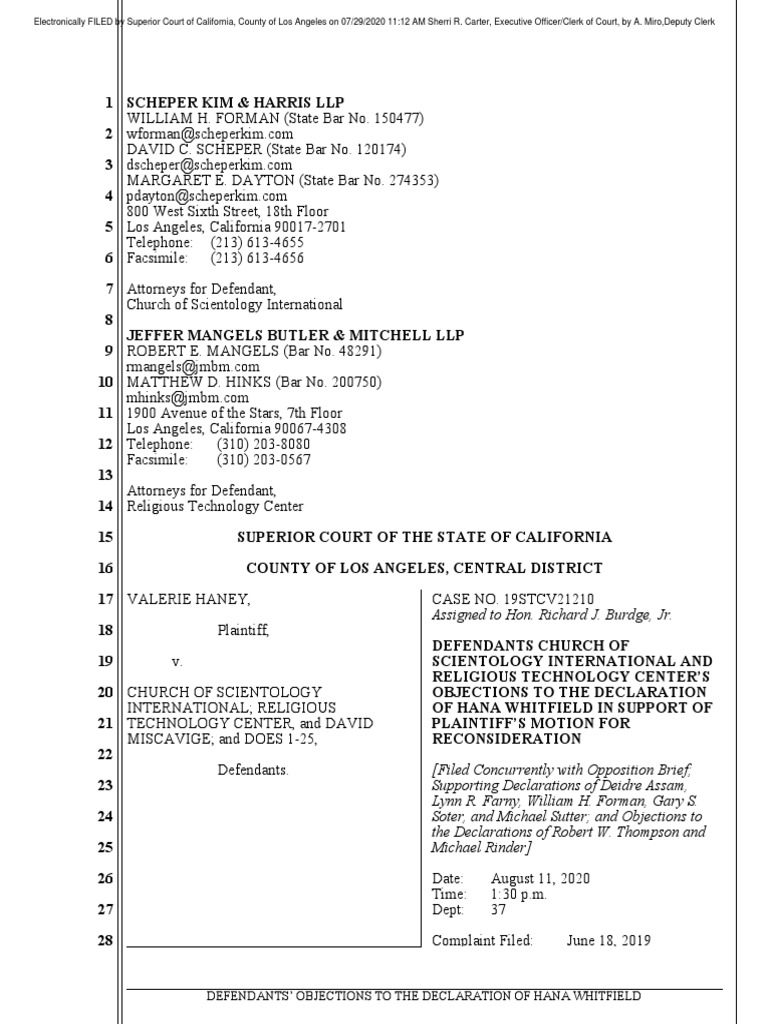 DEFENDANTS CHURCH OF SCIENTOLOGY INTERNATIONAL AND RELIGIOUS TECHNOLOGY CENTER’S OBJECTIONS TO THE DECLARATION OF HANA WHITFIELD IN SUPPORT OF PLAINTIFF’S MOTION FOR RECONSIDERATION