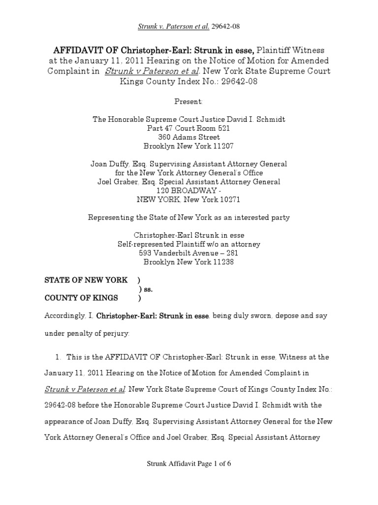 Present: The Honorable Supreme Court Justice David I. Schmidt Part 47 Court Room 521 360 Adams Street Brooklyn New York 11207 Joan Duffy, Esq. Supervising Assistant Attorney General for the New York Attorney General’s Office Joel Graber, Esq. Special Assistant Attorney General 120 BROADWAY - NEW YORK, New York 10271 Representing the State of New York as an interested party Christopher-Earl Strunk in esse Self-represented Plaintiff w/o an attorney 593 Vanderbilt Avenue – 281 Brooklyn New York 11238