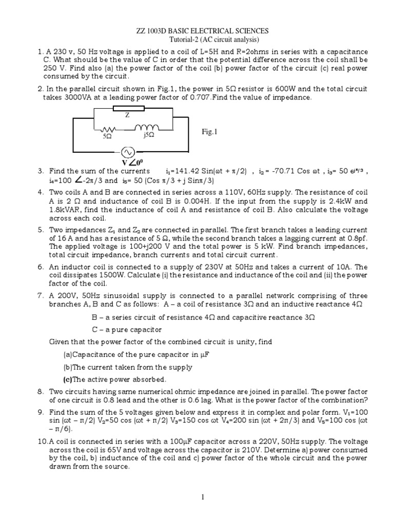 1. A 230 v, 50 Hz voltage is applied to a coil of L=5H and R=2ohms in series with a capacitance