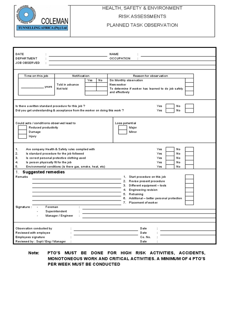 Note: PTO’S MUST BE DONE FOR HIGH RISK ACTIVITIES, ACCIDENTS,