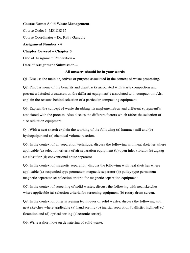 Q1. Discuss the main objectives or purpose associated in the context of waste processing.