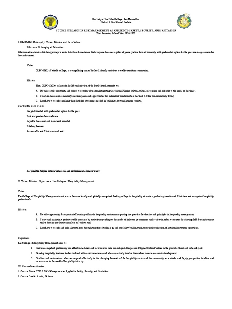 COURSE SYLLABUS IN RISK MANAGEMENT AS APPLIED TO SAFETY, SECURITY, AND SANITATION
