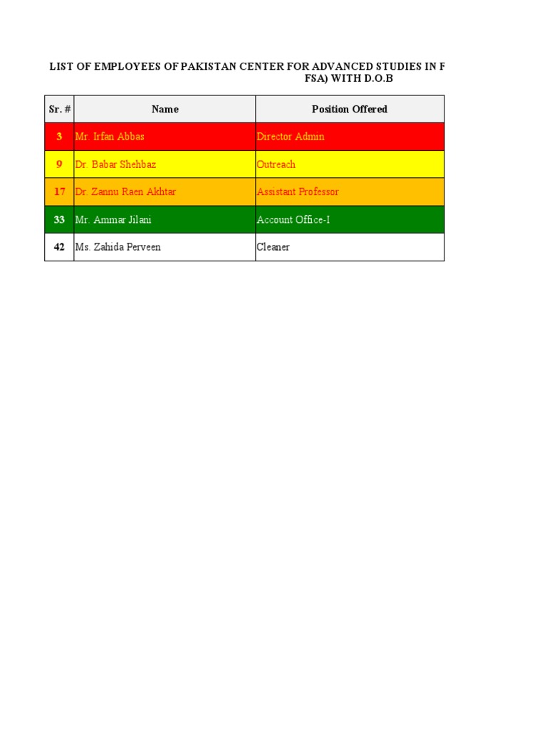 LIST OF EMPLOYEES OF PAKISTAN CENTER FOR ADVANCED STUDIES IN FOOD SECURITY/AG