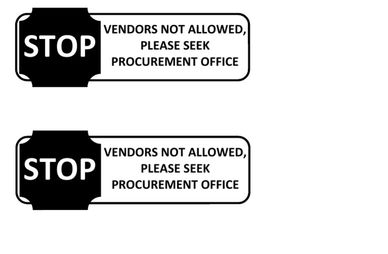 This sign indicates that vendors are not permitted in the area and should seek out the procurement office instead. Vendors stopping in the area are being asked to go to the procurement office rather than remaining where they are. The sign uses capital letters and punctuation to emphasize that vendors should not remain where they are and should proceed directly to the procurement office.