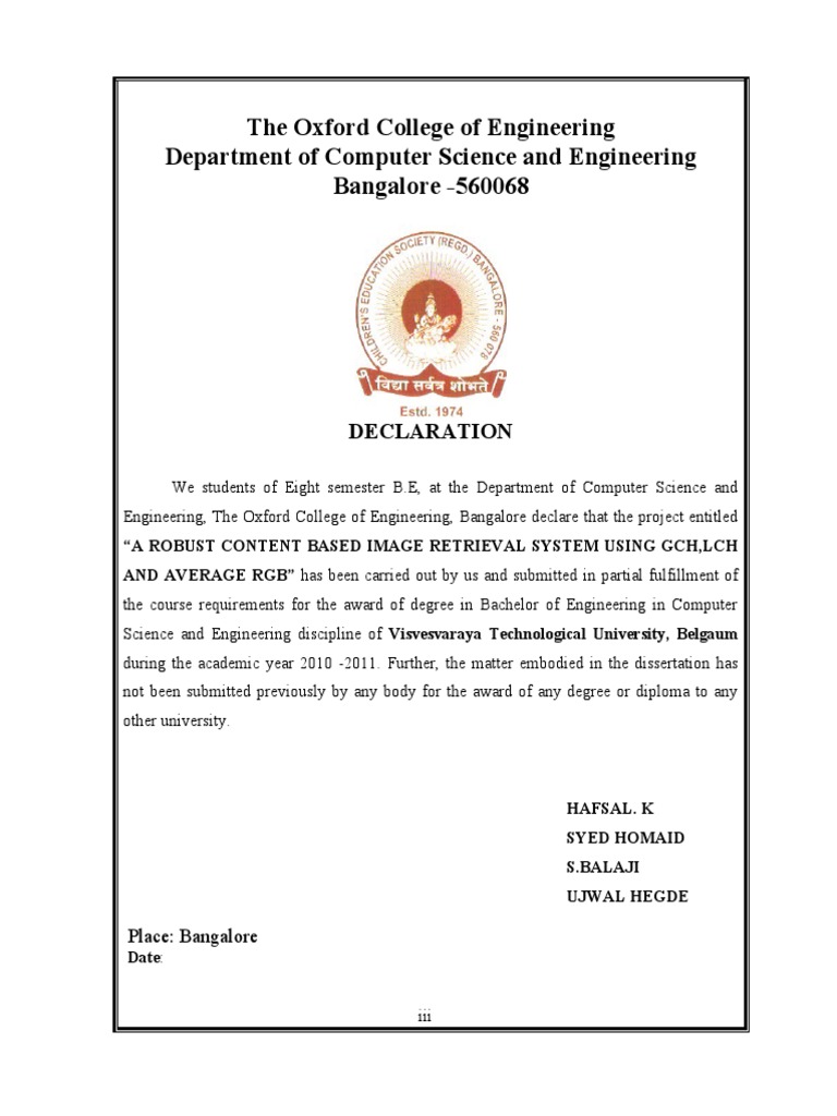 Engineering, The Oxford College of Engineering, Bangalore declare that the project entitled
