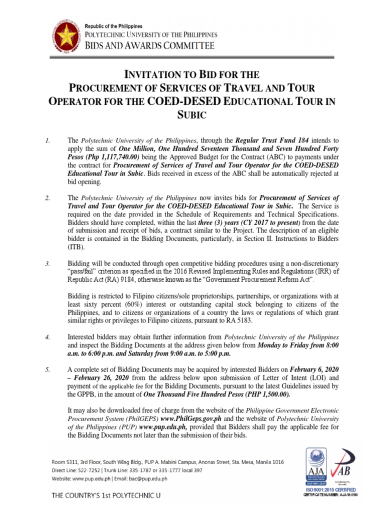 Educational Tour in Subic. Bids received in excess of the ABC shall be automatically rejected at