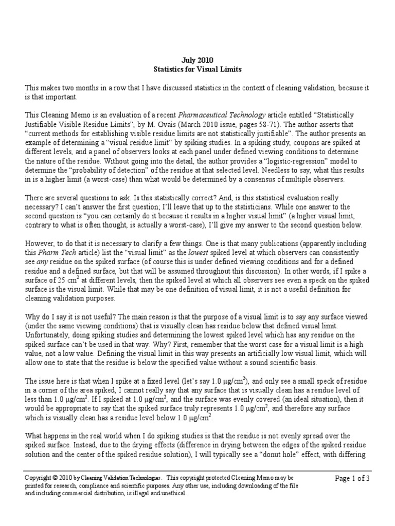 Copyright © 2010 by Cleaning Validation Technologies. This copyright protected Cleaning Memo may be Page 1 of 3