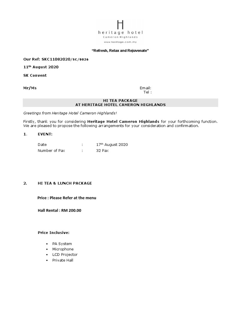 Firstly, thank you for considering Heritage Hotel Cameron Highlands for your forthcoming function.