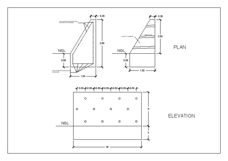The document shows engineering drawings of a concrete structure with rebar reinforcement. It includes a plan view and elevation view. The plan view shows rebar spaced at 300mm centers in two directions. The elevation view shows the structure is made of concrete with a height of 2.80m above natural ground level and includes weep holes.